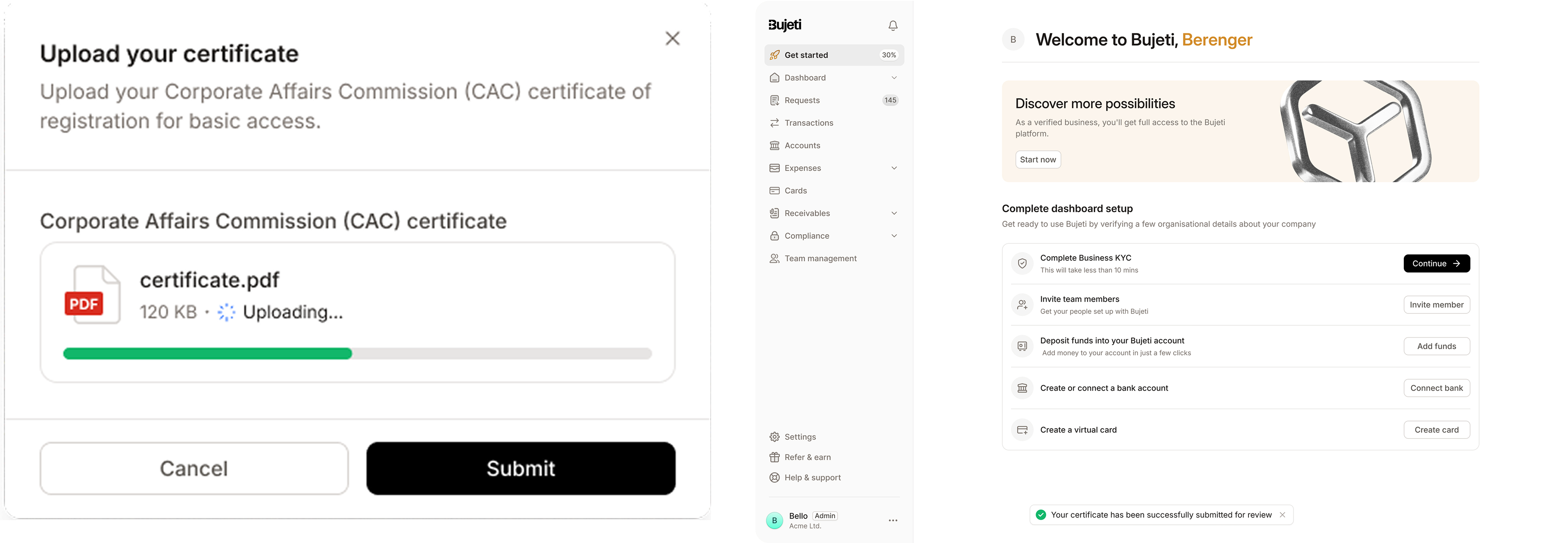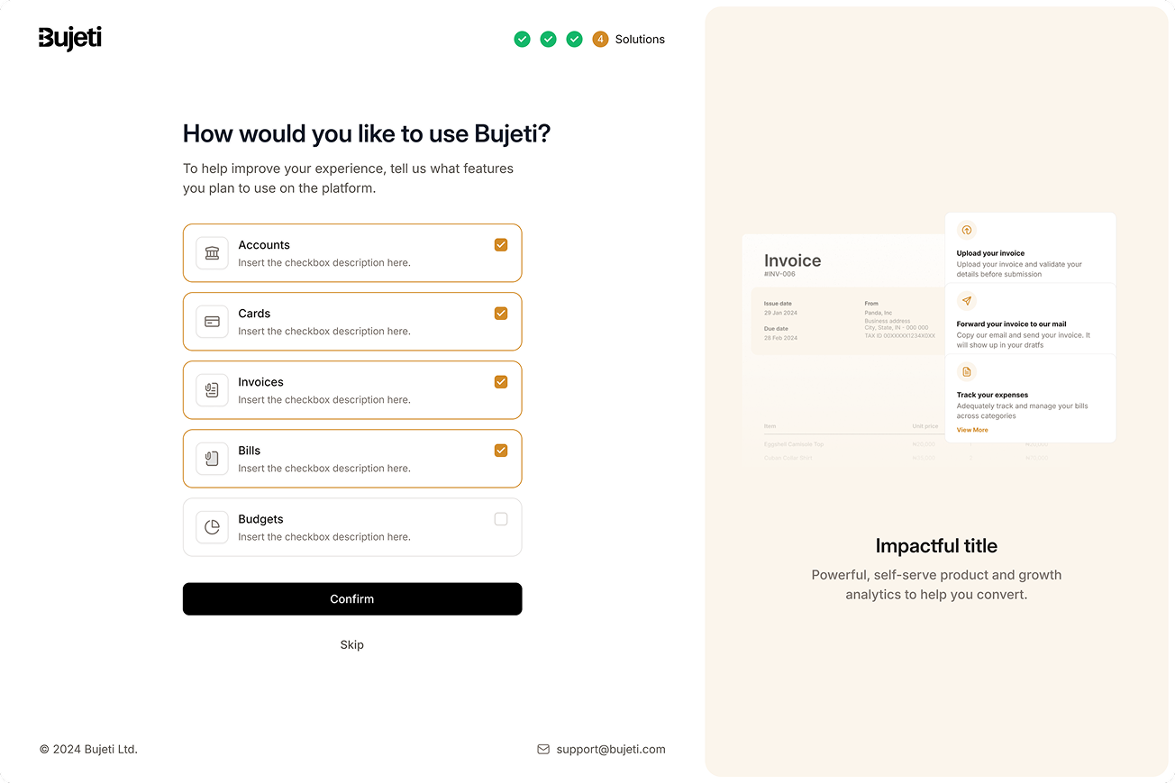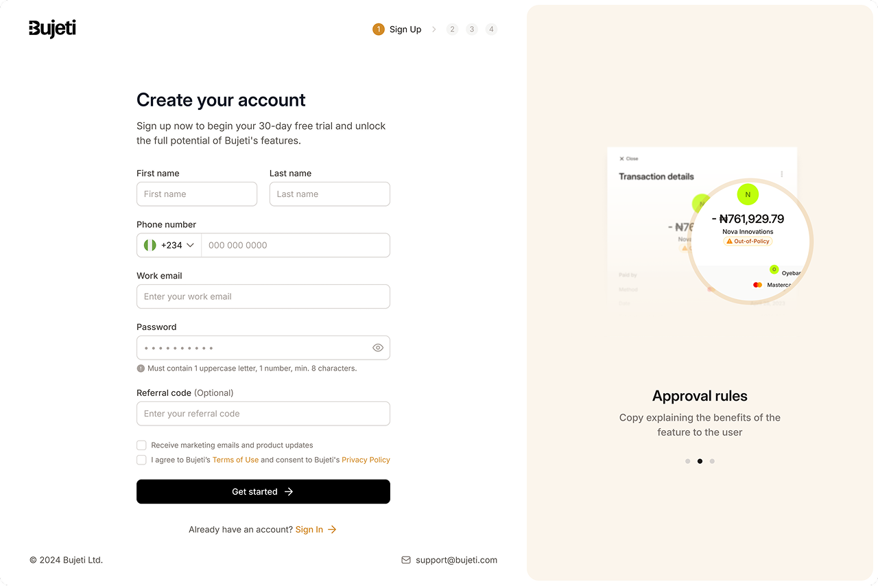 Bujeti was experiencing a high drop-off rate because the process was too lengthy and cumbersome. There were document requirements that not all companies had at the time of registration; as a result, we kept losing leads.
