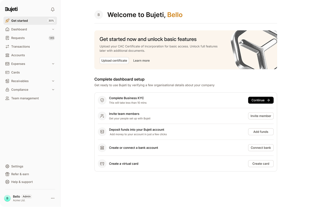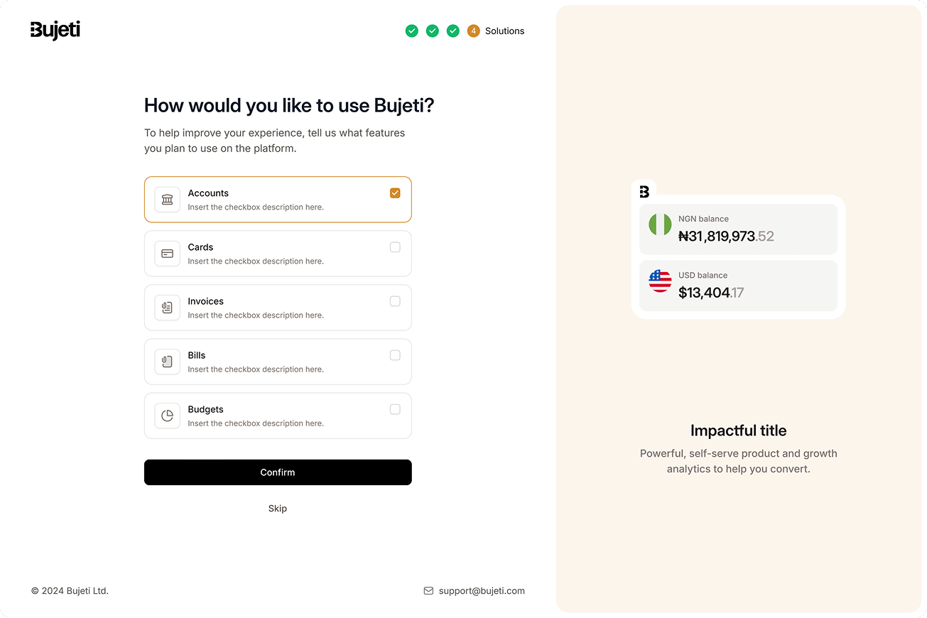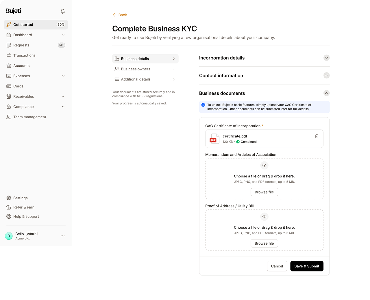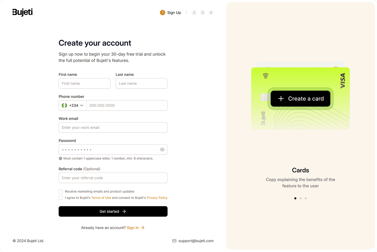 Bujeti was experiencing a high drop-off rate because the process was too lengthy and cumbersome. There were document requirements that not all companies had at the time of registration; as a result, we kept losing leads.